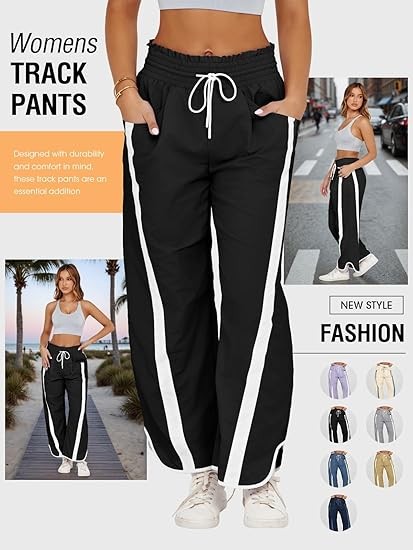 Fisoew Women's Baggy Wide Leg Pants Casual Drawstring Elastic Waisted Contrast Color Workout Y2K Track Pants