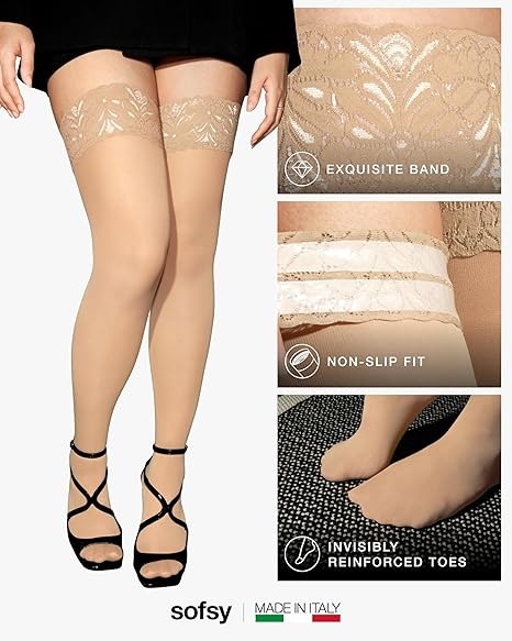 sofsy 100% Oeko-Tex Certified [Made in Italy] Women Opaque Thigh High Stockings | Ultra Soft Dual Silicone Lace Top Hold Ups