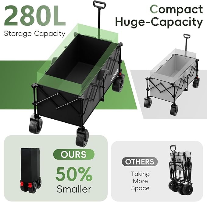 46" L Collapsible Foldable Extended Wagon, 500LB Weight Capacity with 280L Heavy Duty Folding Cart,Utility Wagon with All-Terrain Beach Wheel & Drink Holders,Black