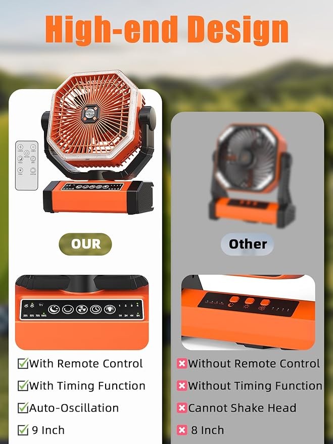 Battery Powered Fan - 9-Inch Rechargeable Fan Portable, 20000mAh(60Hrs) Camping Fans for Tent, Auto Oscillation Cordless, Tent Fans for Camping with Remote/light, 4 Speeds, 4 Timing, Outdoor