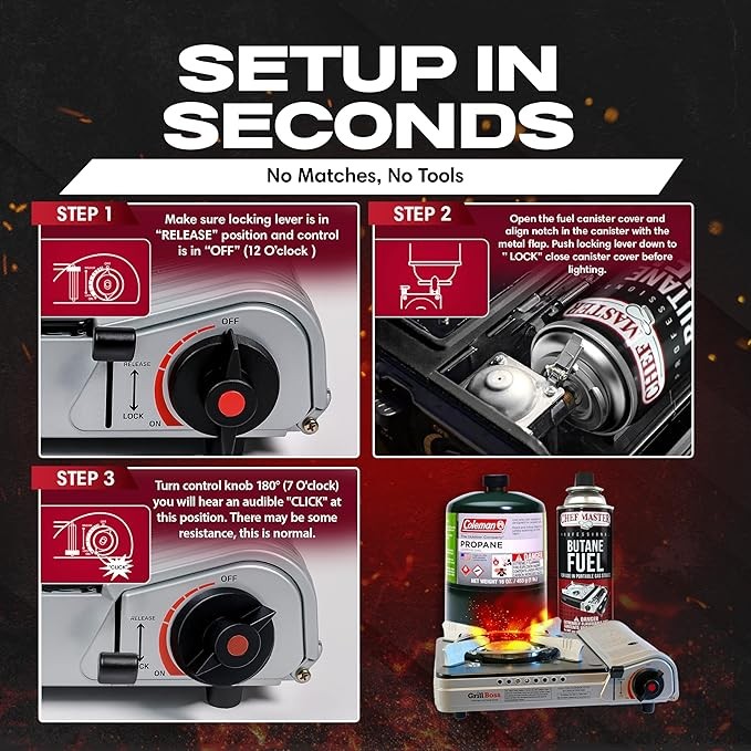 Grill Boss Dual Fuel Portable Stove, Dual Fuel Butane & Propane Stoves, 12K BTU Butane Camp Stove & Propane Portable Camping Stoves for Emergencies, Outdoor BBQ, Cooking, Hikings & Backpacking - 90057