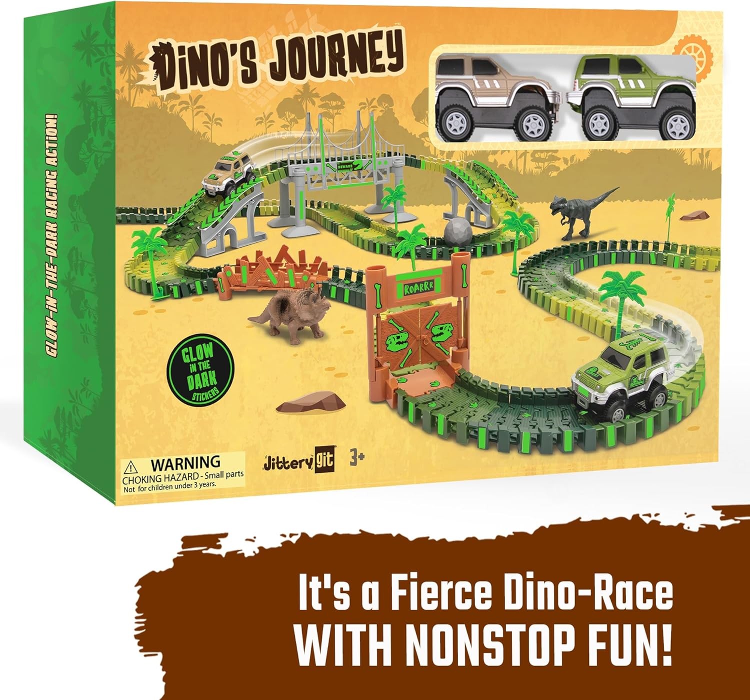 JITTERYGIT Dinosaur Jurassic Race Track Train Glow in The Dark World Toy Set, Kids Dino Racetrack Park Includes T-Rex & Triceratops Playset - Best Birthday Gift for Boys & Girls 3 4 5 6 7 8 Year Old