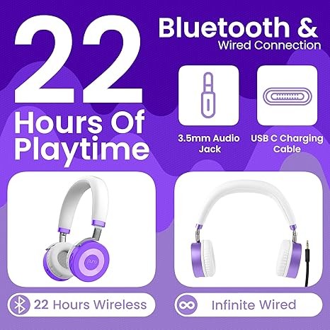 Puro Sound Labs JuniorJam Plus Volume-Limiting Wireless Bluetooth Headphones for Kids, Secure Audio with Adjustable On-Ear Design, 22-Hour Battery, Ideal for Tablets, Smartphones & PCs - Purple