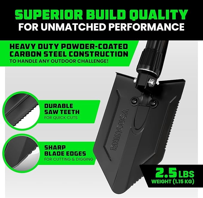 RHINO USA Folding Survival Shovel w/Pick - Heavy Duty Carbon Steel Military Style Entrenching Tool for Off Road, Camping, Gardening, Beach, Digging Dirt, Sand, Mud & Snow.