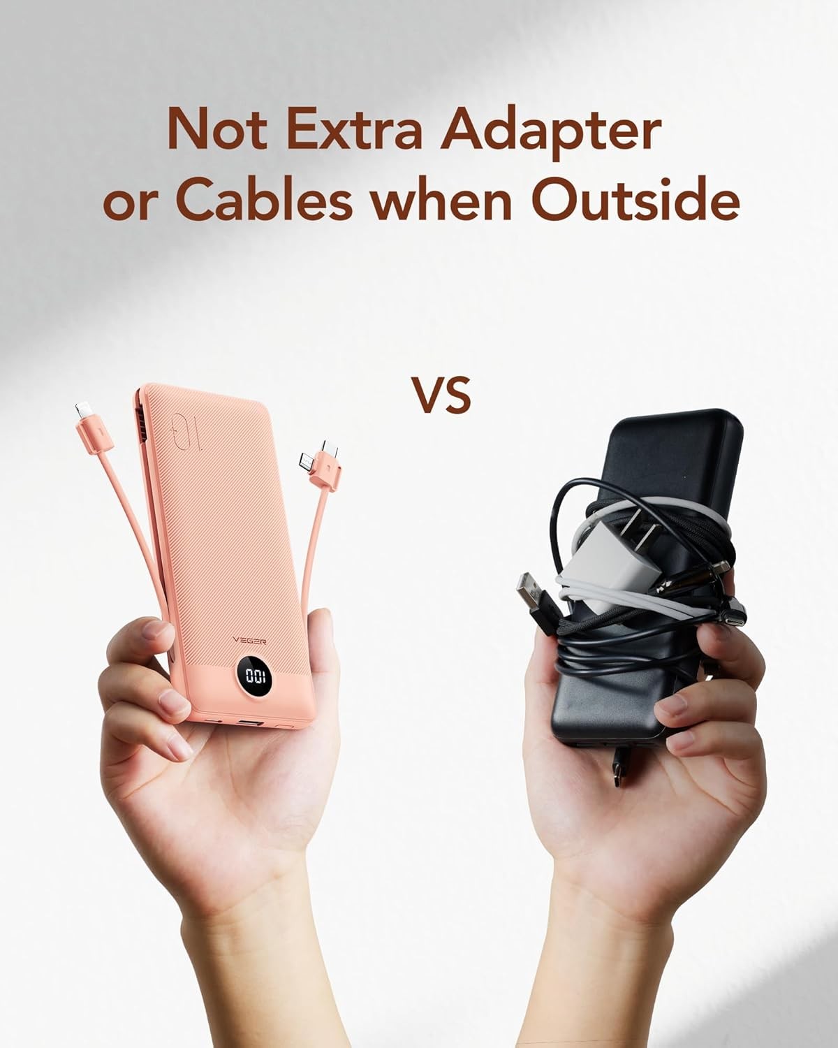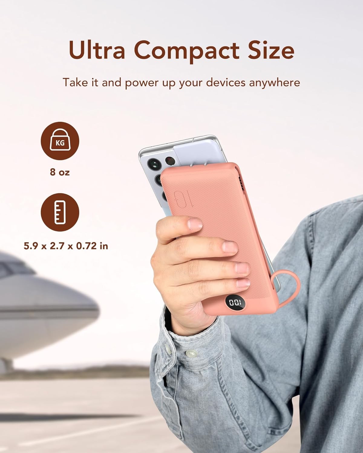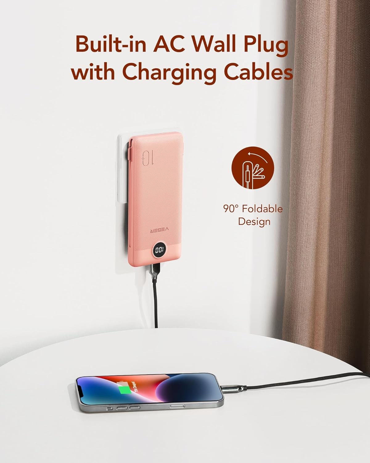 VEGER Portable Charger for iPhone Built in Cables and Wall Plug, 10000mah Slim Fast Charging USB C Power Bank, Travel Essential Battery Pack Compatible with iPhones, iPad, Samsung More Devices(Pink)
